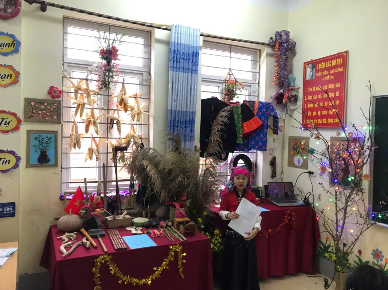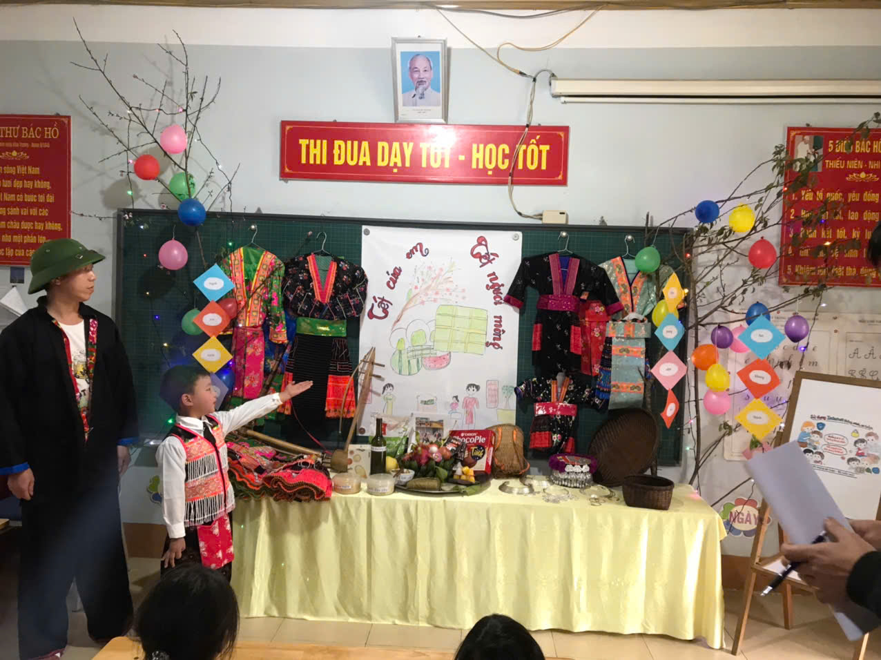 Sân trường hôm nay bỗng khoác lên mình sắc xuân rực rỡ. Đó là sắc váy áo thổ cẩm lung linh trong nắng mới, là tiếng khèn ngân vang như gọi mùa xuân thức giấc, là những điệu múa mềm mại tựa dòng suối chảy qua bản làng. Những góc Tết dân tộc được dựng lên mộc mạc mà ấm áp, kể câu chuyện về phong tục, tập quán, về nếp sinh hoạt ngày xuân của đồng bào Mông nơi miền núi cao.
